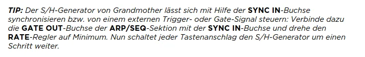 Ja, korrekt. Diesen Abschnitt habe ich vorher auch gelesen, da Behringer ja keine eigene Anleitung liefert. Die überlassen es Moog, die Anleitungen für ihre Synths zu schreiben...Ich vermute mal, daß wie bei der Moog Grandmother die S&H Geschwindigkeit vom LFO gesteuert wird. Hier der entsprechende Ausschnitt aus der Moog Anleitung. Das dürfte beim Model 15 genauso sein.