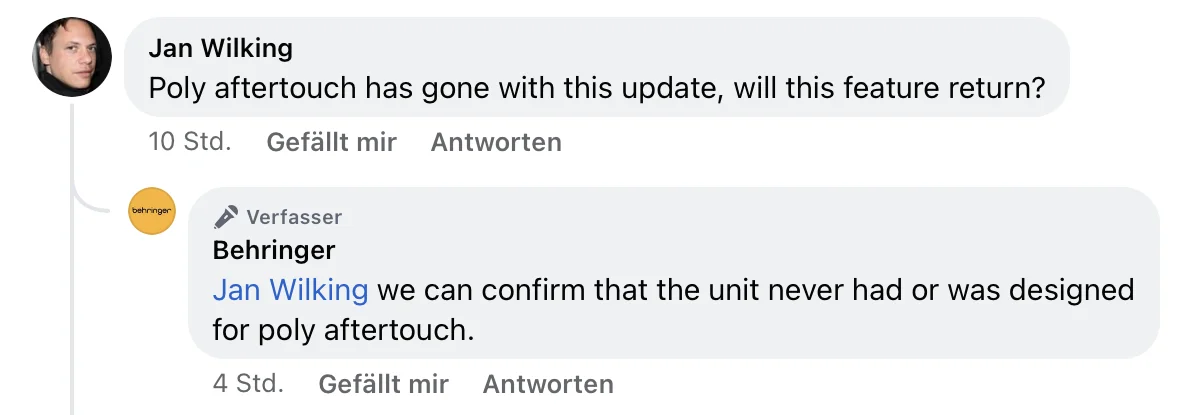 Support. Ob und wann das kommt, kein Plan.Och nö, dann muss ich meinen Testbericht ja schon wieder umschreiben. Aber grundsÀtzlich soll Poly Aftertouch als Feature bleiben? Wo hast du denn die info her?