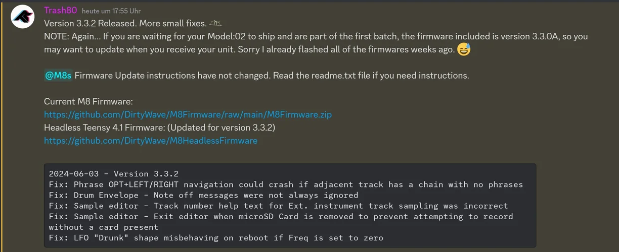 Version 4.0.0 Released. EQs, Instrument Pool, Launchpad support, Wavsynth wavetables...@M8s Firmware Update instructions have not changed. Read the readme.txt file if you need instructions.Current M8 Firmware:https://github.com/DirtyWave/M8Firmware/raw/main/M8Firmware.zipHeadless Teensy 4.1 Firmware: (Updated for version 4.0.0)https://github.com/DirtyWave/M8HeadlessFirmware