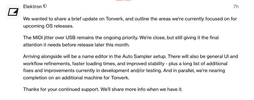Für mich klingt es nicht so das die neue Machine schon mit dem nächsten Update kommt aber wir werden ja sehen.Drüben bei den Elektronauten hat sich Elektron mal wieder zu Wort gemeldet. Man darf gespannt sein, vor allem wegen der neuen Maschine (wobei mich Bugfixes und QoL-Verbesserungen erst einmal glücklicher machen würden).