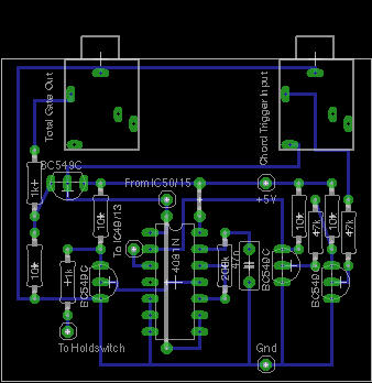 Darüberhinaus kann man aus dieser Total-Gate einen Trigger auf den Start ableiten. Mit diesem Trigger (zusätzlich noch invertiert) füttere ich den Holdschalter. Die Wirkung ist, dass das Hold bei jedem neu gegriffenen Akkord ganz kurz unterbrochen wird, und dann aber sofort wieder gesetzt wird. Bei der normalen Holdfunktion bleiben ja bei Akkordwechseln auch die Noten der vorherigen Akkorde stehen, bis die sechs Stimmen aufgebraucht sind. Mit der neuen Hold-Methode wird immer nur der zuletzt gegriffene Akkord gehalten. Man nennt das "Keyed Hold" oder "Chord Hold".