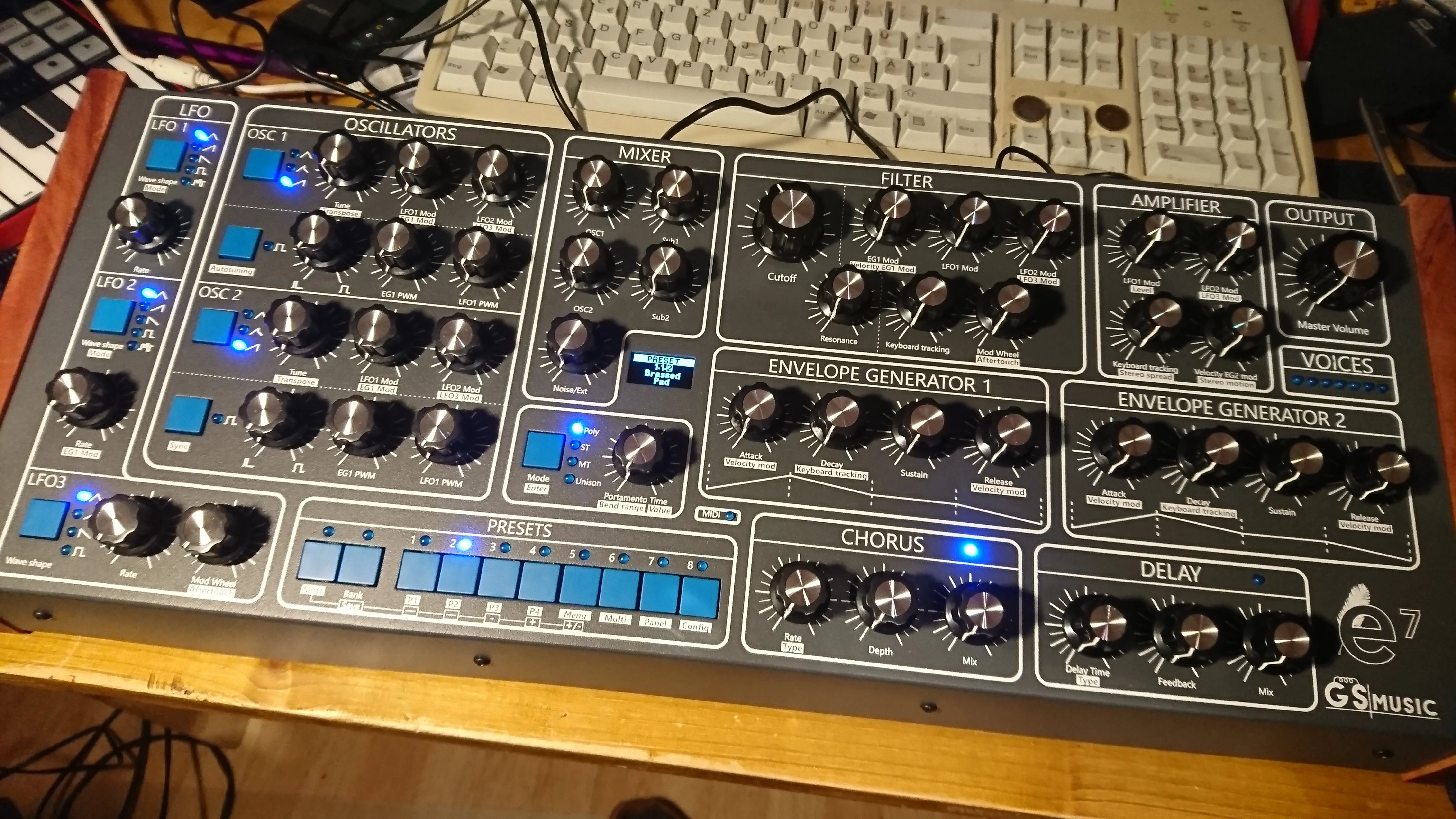 Also hier geht es um den GS Music e7, ein analoger 7 stimmiger polyphoner Synthesizer aus Argentinien.