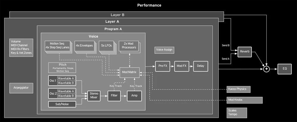 Laut den obigen Schemabild sind die Motionsequences Bestandteil einer Voice und man kann verschiedene Looppunkte setzen und modulieren. Die Motionsequencen können auch mit dem Arpegiator interagieren. Die Physik Modulationen vom Kaospad sind allerdings Global.Pro Stimme, polyfon mit Loops?