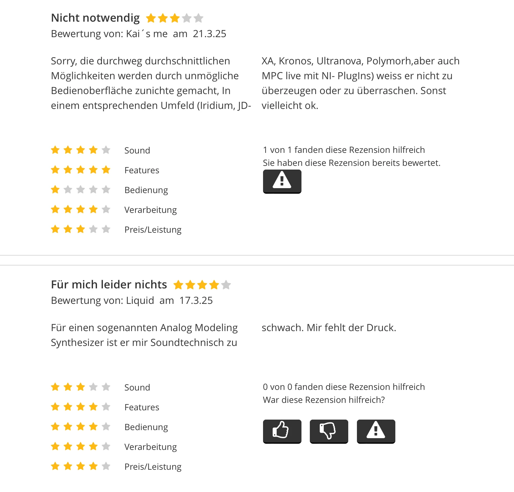 Sind das Bewertungen vom Multi Poly? Mir werden gar keine angezeigt…. weder Rack noch Tastatur…. oder von welchem Synth stammen die Bewertungen?