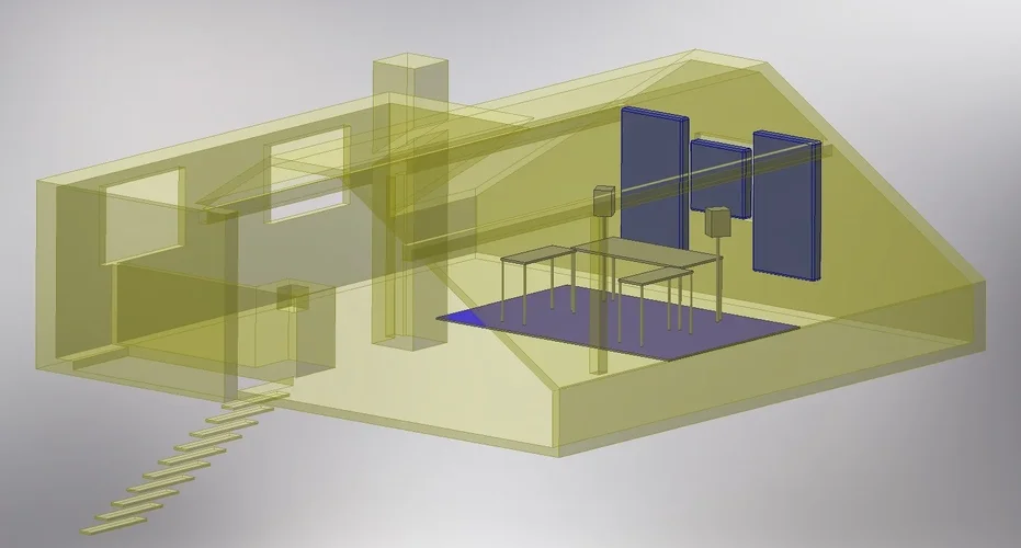 Hinter den Lautprechern hängen aktuell 15cm dicke Breitbandabsorber. Einen Meter breit und zwei Meter hoch.