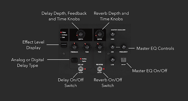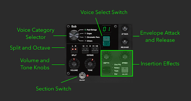 Pads, strings, basses, brass, leads, organs… That’s what the Sub Section is all about. Because this Section is often used for synth pad layers behind an acoustic or electric piano basic Attack and Release envelope controls are here to fine tune your sound. If you want to split the keyboard and play left hand bass you’ll find acoustic, electric and synth basses in the Sub Section. And a decent selection of tone wheel, combo and pipe organ are here along with a rotary speaker effect controllable with the modulation slider.