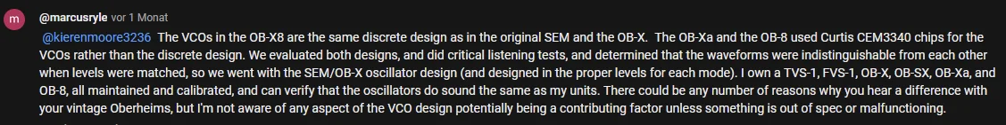 Aber genau das selbe Bild/Diskussion gab es schon beim OB-6//Prophet 6. Da war das genau dasselbe, der OB-6 kann weniger, klingt aber würziger. Wer eher Flexibilität sucht, soll sich den P6 holen.