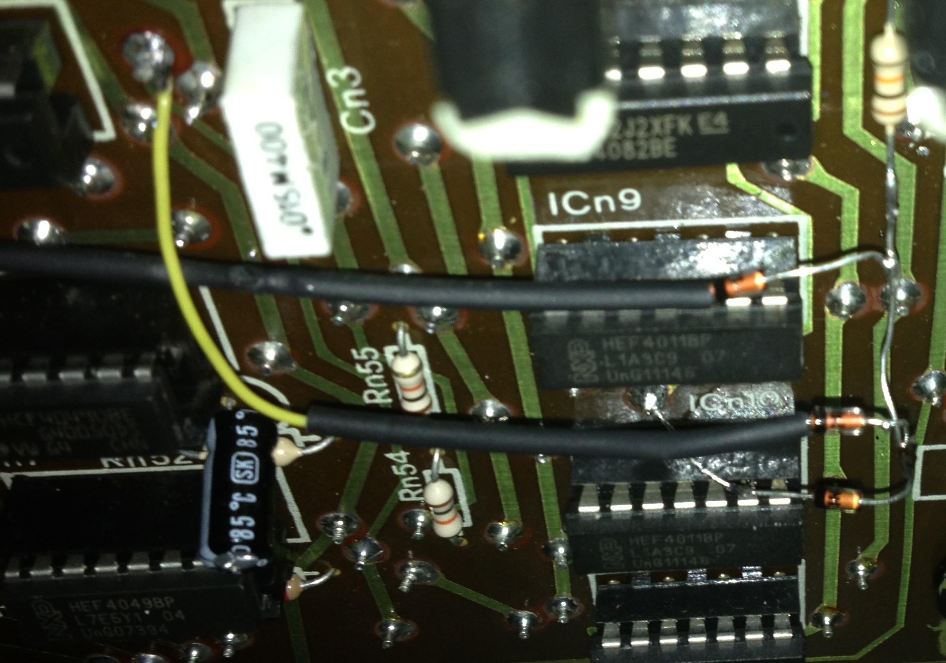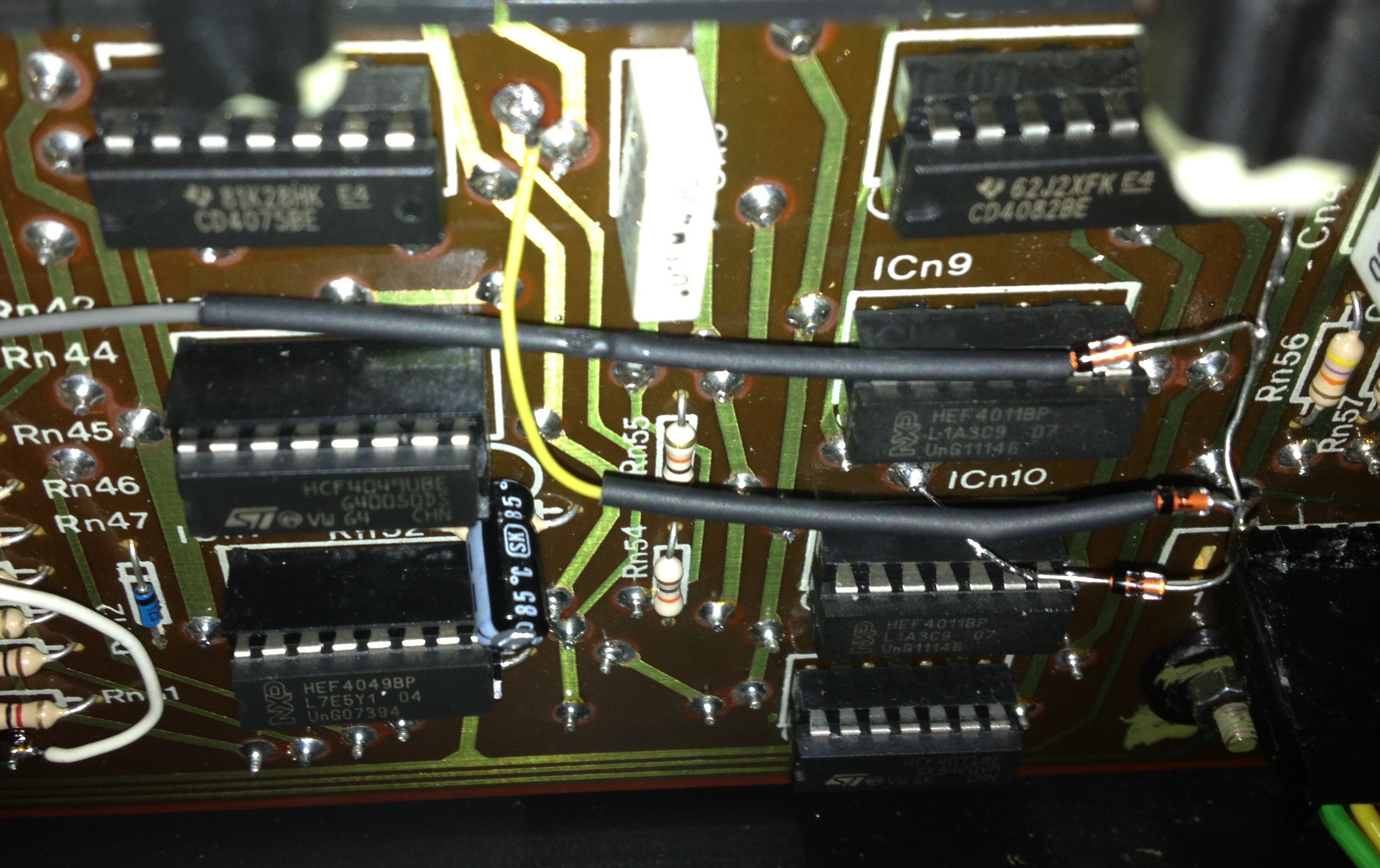 Eine Leiterbahn hinter dem Inverter ICn7 muss durchtrennt werden (Leiterbahn aufkratzen, Durchkontaktierung entfernen - an der Stelle gibt es mehrere Möglichkeiten, siehe Bilder), um zur Entkopplung den 45k Widerstand einfügen zu können. Ansonsten sorgt eine AND-Schaltung mit Dioden dafür, dass, sobald die Brass & Piano Schaltstränge beide HIGH sind, der Eingang 6 von ICn3 ebenfalls auf HIGH gehalten wird. Im Normalzustand ist der Ausgang des Inverters bei aktivierter Brasssection HIGH, bei aktiviertem Piano und Piano/Brass-Mix jedoch LOW - bei LOW wird die Pianohüllkurve geschaltet und die VCF-Hüllkurve deaktiviert.