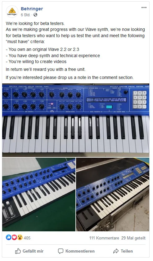 Behringer sucht Beta Tester für ihren PPG Nachbau. Die Anmeldung erfolgt im Kommentarfeld unterhalb des Beitrags in der öffentlichen Facebook Behringer Gruppe. Jetzt könnten die Inhaber der einzig wahren Wahrheit ja theoretisch teilnehmen und das Produkt besser machen, aber genau das werden sie nicht tun. Denn sie haben keine Facebook Accounts oder sie wollen nicht für Behringer arbeiten oder Wolfgang nicht in den Rücken fallen oder oder. Es gibt tausend Gründe.