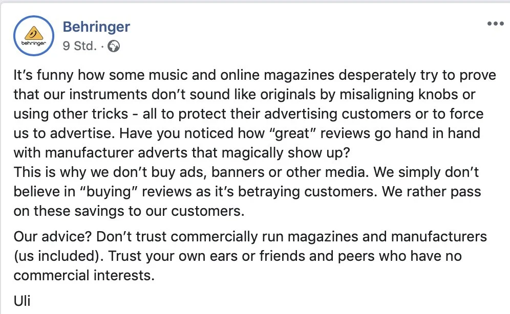 Das ist aber egal, da die meisten keine Mags oder Blogs sind, die User lieben Behringer vielleicht sogar für den Spruch. Kann ich auch verstehen - so Robin Hood - macht billiger und klingt sich aus dem Sumpf aus - das soll es sicher senden, nur ist der Sumpf nicht unbedingt so - jedenfalls nicht beim SynMag oder Sequencer.de oder so, also für die wo ich weiss - da berichtet man gern über alles - aber das klingt nach - mach mal lieber nich' finden wir doof.